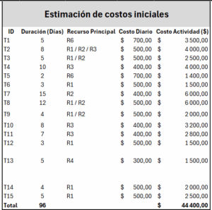 Posteriormente tomando la lista de tareas junto a los recursos asignados realizaron el análisis de costos de cada tarea, el resultado fue el siguiente: